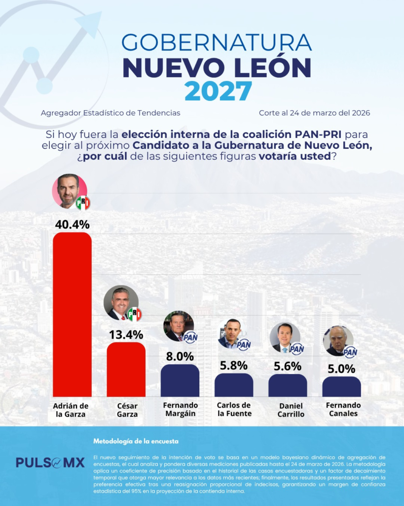 En cuanto a la configuración general de la contienda, la distribución de preferencias muestra una clara inclinación hacia el bloque priista, donde Adrián de la Garza (40.4%) y César Garza (13.4%) concentran la mayor parte del capital político disponible, mientras que el bloque del PAN presenta una fragmentación notable que diluye su impacto individual. En este último grupo, Fernando Margáin encabeza la lista con un 8.0%, seguido por una competencia estrecha entre Carlos de la Fuente (5.8%), Daniel Carrillo (5.6%) y el exgobernador Fernando Canales, quien cierra la medición con un 5.0%. Esta estructura revela que, si bien la coalición mantiene una diversidad de perfiles, el peso de la intención de voto se encuentra actualmente centralizado en las figuras con mayor peso territorial reciente.