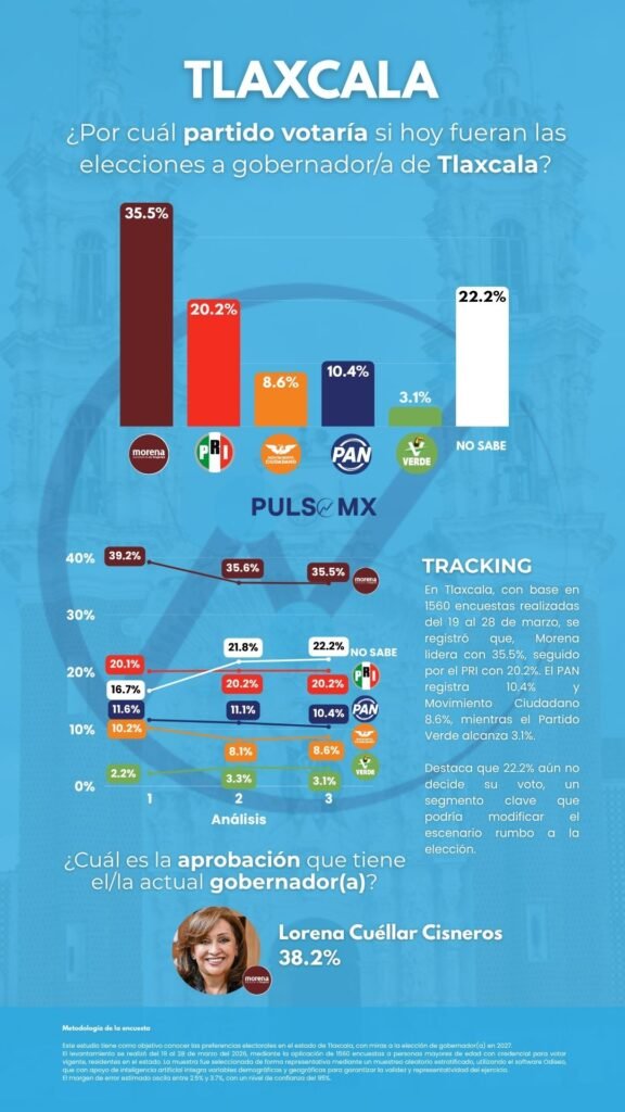 Metodología del estudio Este estudio tiene como objetivo conocer las preferencias electorales en el estado de Tlaxcala, con miras a la elección de gobernador(a) en 2027. El levantamiento se realizó del 19 al 28 de marzo de 2026, mediante la aplicación de 1560 encuestas a personas mayores de edad con credencial para votar vigente, residentes en el estado. La muestra fue seleccionada de forma representativa mediante un muestreo aleatorio estratificado, utilizando el software Odiseo, que con apoyo de inteligencia artificial integra variables demográficas y geográficas para garantizar la validez y representatividad del ejercicio. El margen de error estimado oscila entre 2.5% y 3.7%, con un nivel de confianza del 95%